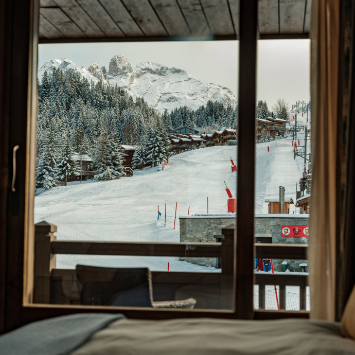 Nos chambres Vue Piste donnent sur le Belvédère, la piste principale de Courchevel Moriond, et sur l'école de ski, ce qui vous permet de profiter du paysage de montagne depuis le confort de votre lit. Chaque chambre Vue Piste dispose d'un lit king-size et d'une salle de bain privative.